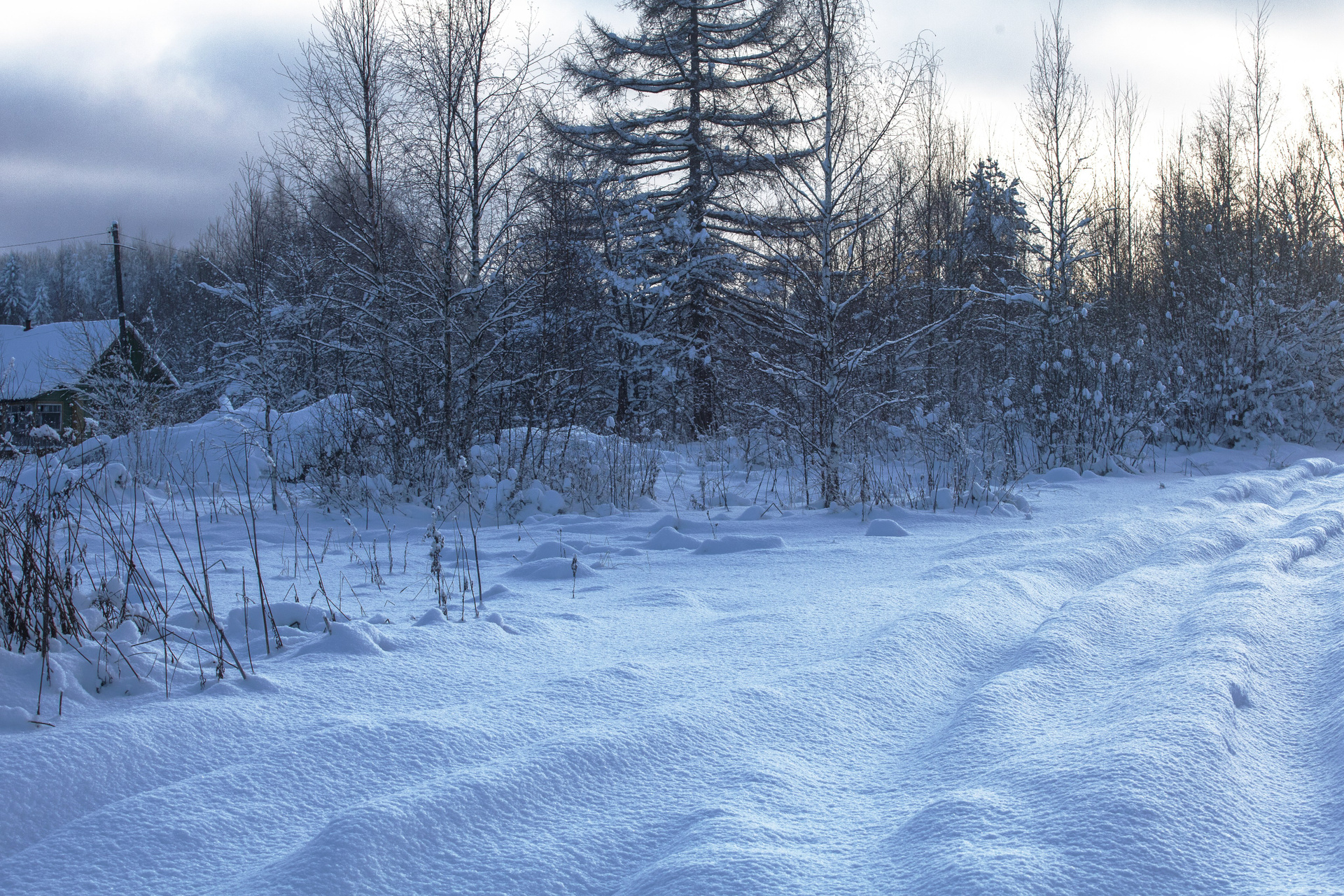 - Пригород: Заброшенные дачи, поля с островками снега, лесные опушки.